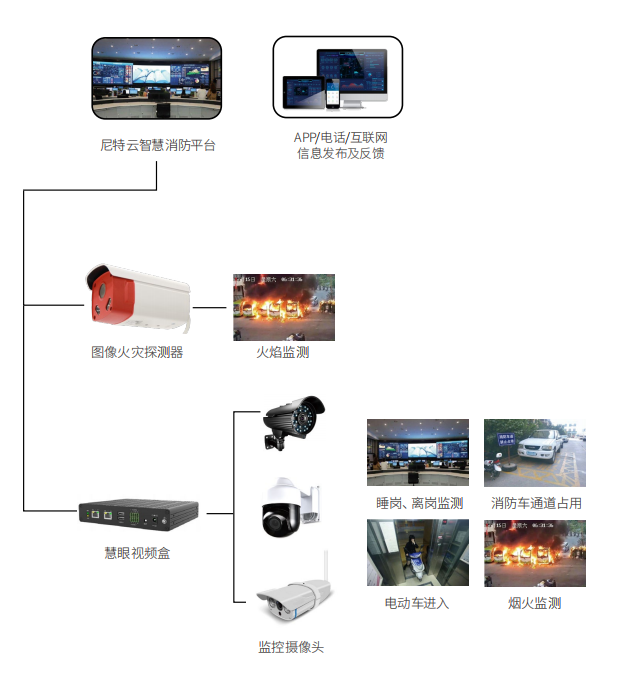AI視頻監(jiān)測系統(tǒng)綜合運用人工智能、大數(shù)據(jù)、云計算、物聯(lián)網(wǎng)、5G等前沿技術(shù),可以接入火災(zāi)報警系統(tǒng)、智慧用電系統(tǒng)、可燃氣體探測報警系統(tǒng)、無線消防產(chǎn)品等;同時平臺可以接入視頻監(jiān)控設(shè)備,實現(xiàn)物聯(lián)網(wǎng)消防監(jiān)控系統(tǒng)與安防監(jiān)控系統(tǒng)的一體化融合。AI視頻監(jiān)測系統(tǒng)分為視頻播放模塊、視頻聯(lián)動模塊、歷史視頻回放模塊,對建筑物重要部位實時監(jiān)控,發(fā)生火災(zāi)時聯(lián)動展現(xiàn)報警點視頻對人員在離崗狀態(tài)、消防通道堵塞狀態(tài)、電動車進入電梯等實時發(fā)送報警信息并聯(lián)動展示和錄制視頻和截圖。