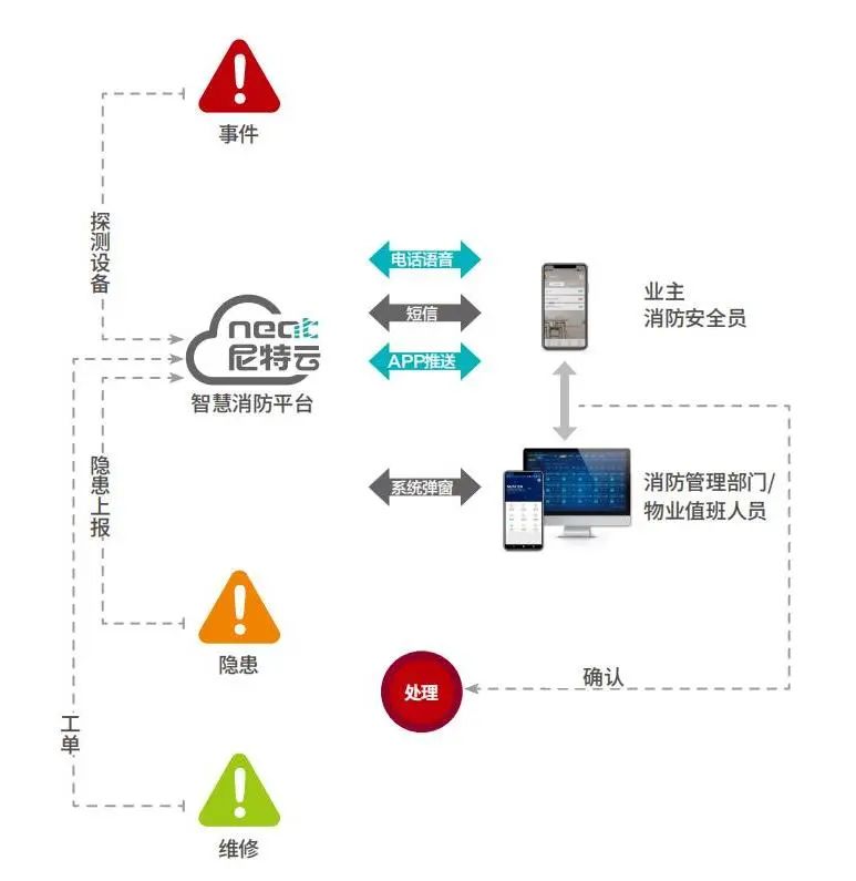 尼特前端感知設備可以實時監測高層住宅內煙霧、可燃氣體、電氣火災,及時發現火災隱患,發生異常情況,第一時間將數據實時傳輸至尼特云智慧消防管理平臺,并通過語音電話、短信、小尼平安APP推送等多種方式及時通知給業主或物業進行復核,監管中心同步聯動復核,借助多層級消防預警將安全隱患扼殺在萌芽狀態。