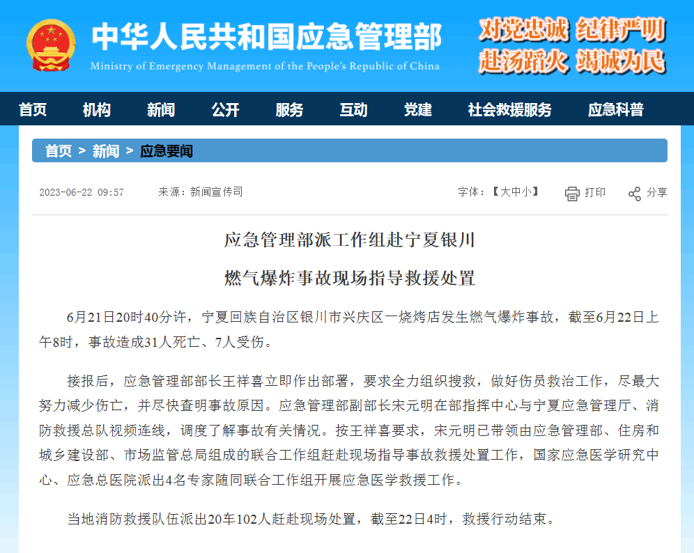 6月21日20時40分許,寧夏回族自治區銀川市興慶區富洋燒烤店發生燃氣爆炸事故,截至6月22日8時,事故造成31人死亡、7人受傷。