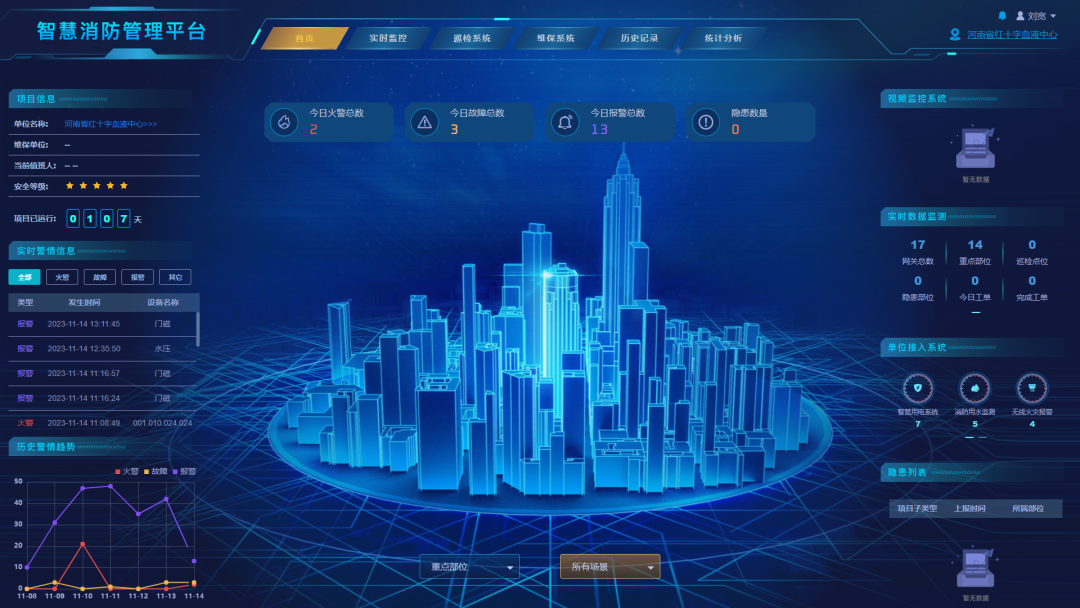 對報(bào)警信息進(jìn)行統(tǒng)計(jì),生成周報(bào)、月報(bào)、季度報(bào)和年報(bào),建立設(shè)備的信息化管理流程,將管理日志、運(yùn)行日志、巡查日志生成電子檔案,實(shí)現(xiàn)血液中心消防管理工作的痕跡化。