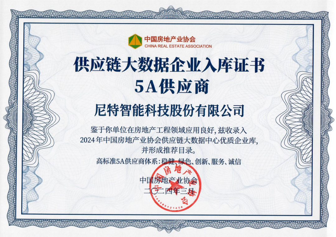 連續7年榮登TOP500首選品牌榜單,并以5A供應商身份成功入選“2024年中國房地產業協會供應鏈大數據中心優質企業庫”,充分彰顯了尼特智能在助力房建供應鏈協同發展中的標桿地位!