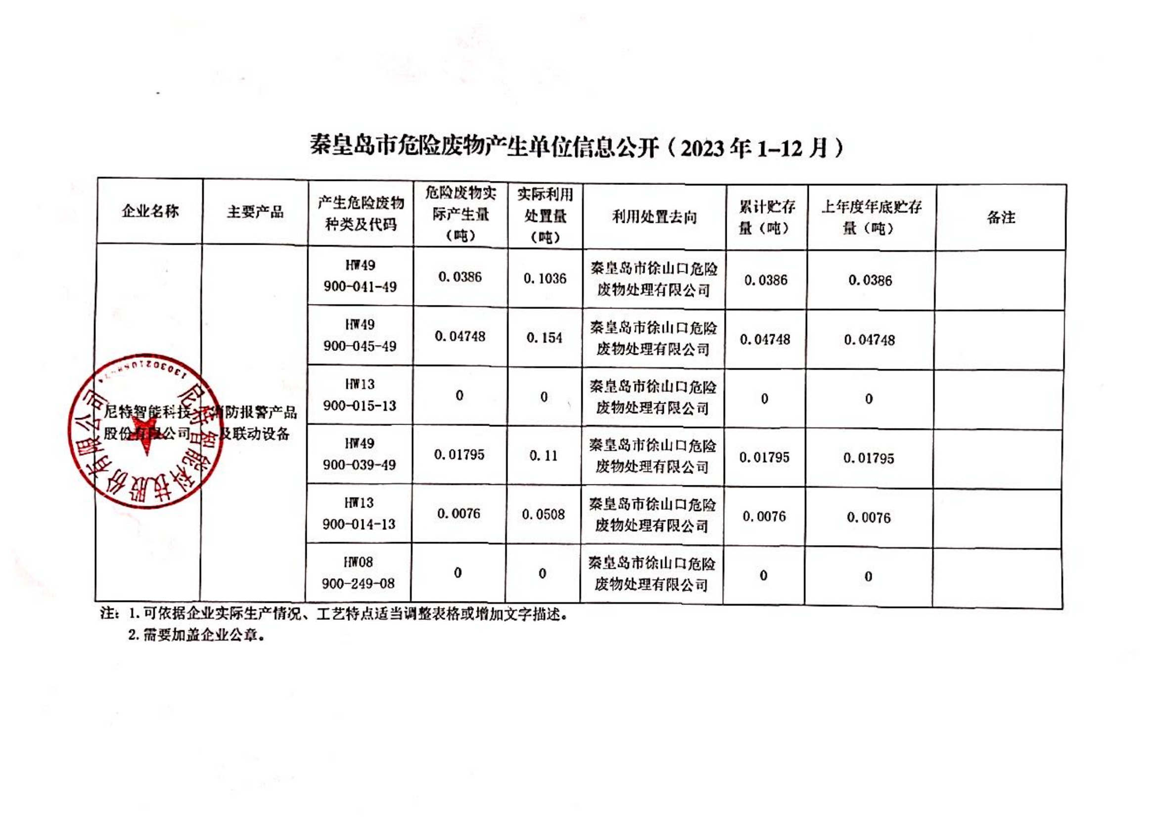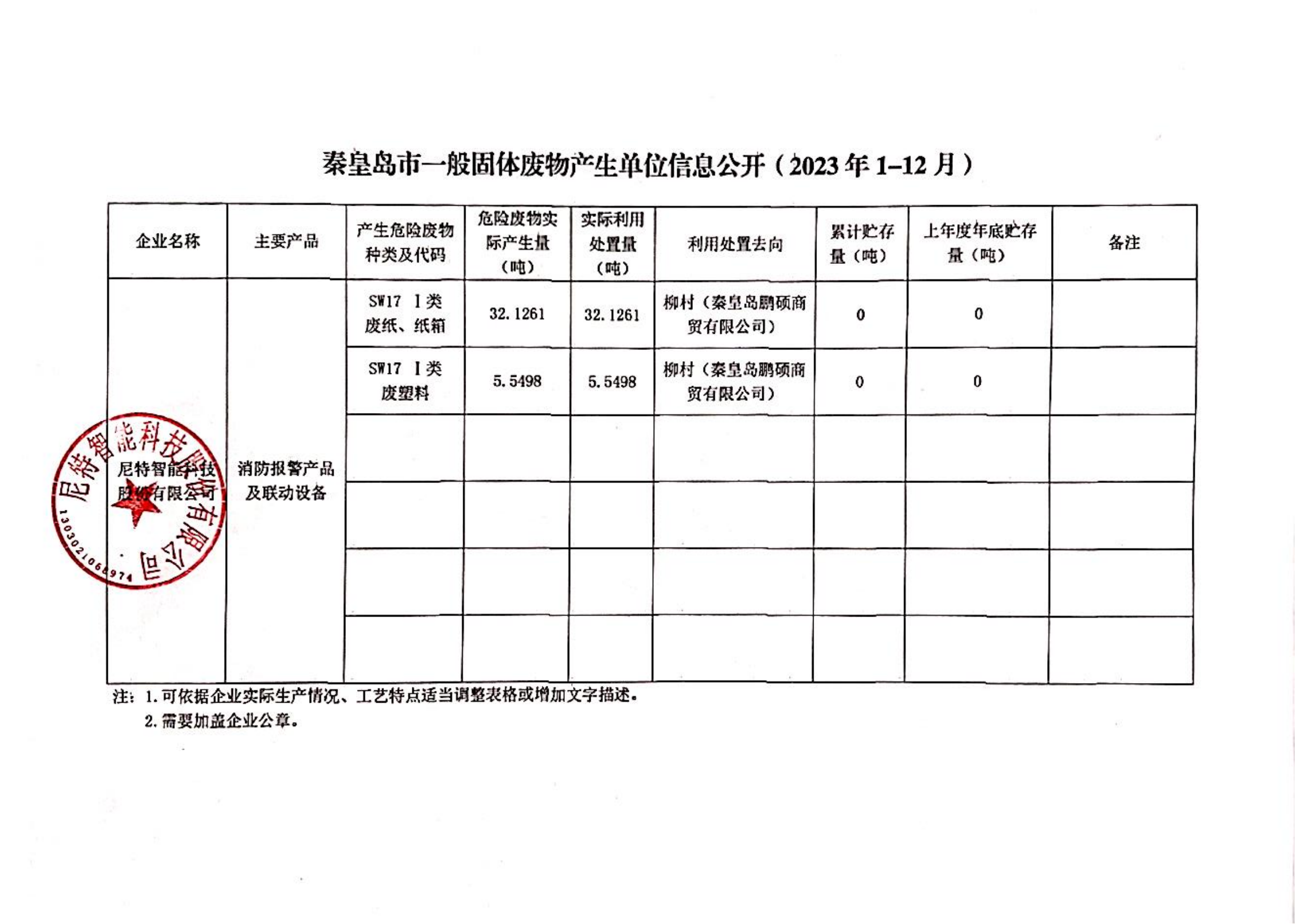 尼特智能公司2023年度一般固廢和危險廢物產生單位信息公開