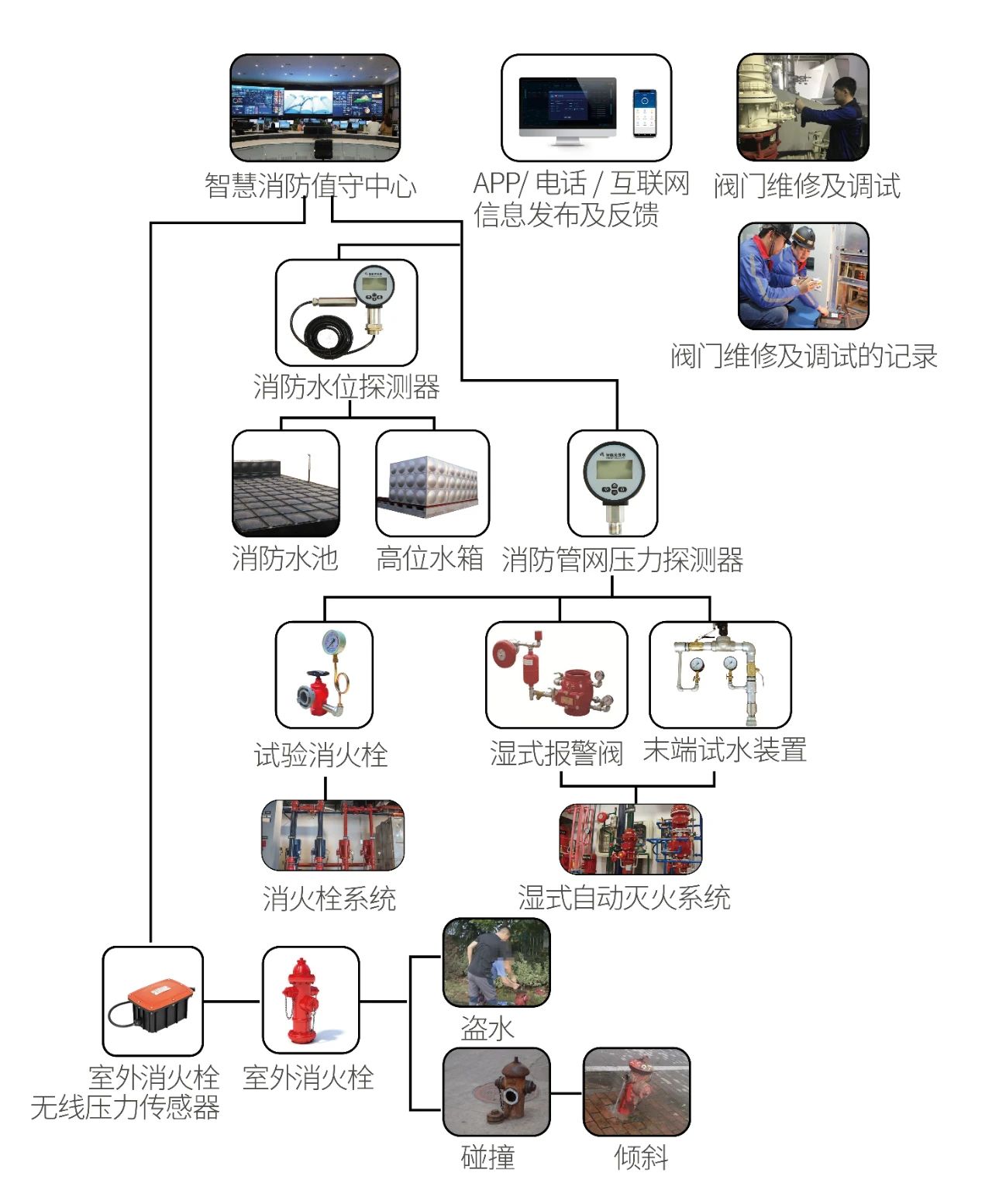 在高位水箱、消防水池、噴淋系統(tǒng)的末端試水裝置及室內(nèi)外消火栓系統(tǒng)等關(guān)鍵部位安裝無線感知設(shè)備,實(shí)時(shí)探測(cè)消防栓、噴淋系統(tǒng)、高位水箱水位等數(shù)據(jù),快速識(shí)別消防水源異常及故障狀態(tài),實(shí)現(xiàn)對(duì)室內(nèi)消火栓管網(wǎng)、噴淋管網(wǎng)和室外消火栓管網(wǎng)的主動(dòng)管理,保證消防水箱、消防水池、消火栓的水位處于正常水平范圍內(nèi),確保消防水源正常使用。