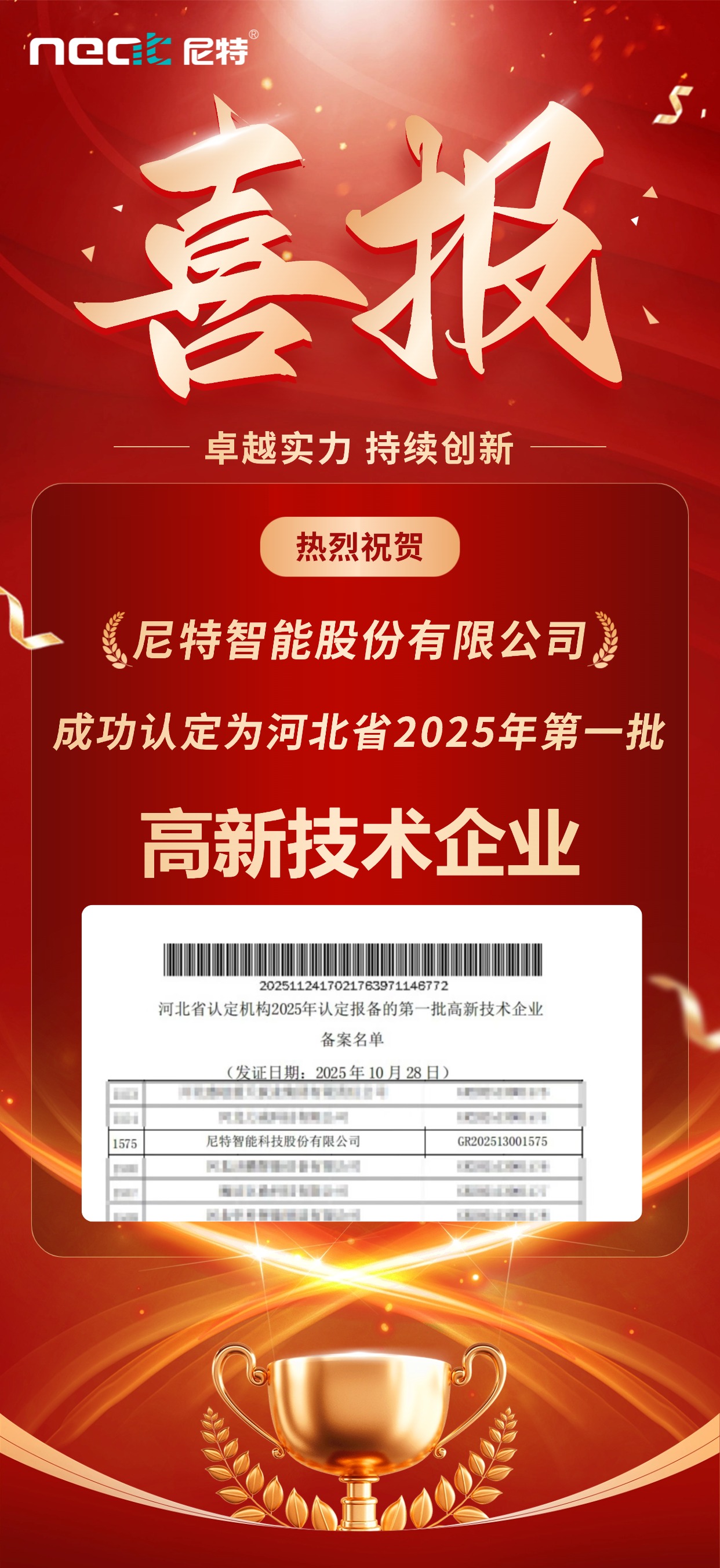 喜報!尼特智能成功認定為河北省2025年第一批高新技術企業