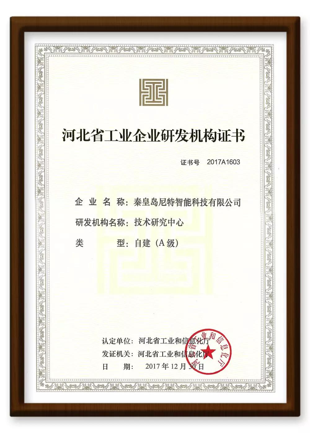 經(jīng)過嚴(yán)格的資料審核及認(rèn)定,尼特公司在研發(fā)機(jī)構(gòu)人員、研發(fā)機(jī)構(gòu)場地、研發(fā)儀器設(shè)備原值、研發(fā)經(jīng)費占比、在研項目等各個方面均符合A級認(rèn)定條件,被河北省工業(yè)和信息化廳授予“河北省工業(yè)企業(yè)研發(fā)機(jī)構(gòu)(A級)證書”(證書號:2017A1603)。