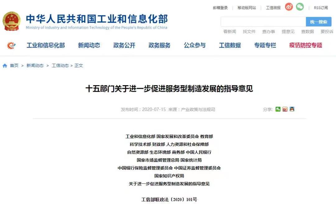 為貫徹黨中央、國務院關于推動先進制造業和現代服務業深度融合,發展服務型制造的決策部署,推動制造業高質量發展,工業和信息化部等部門聯合印發了《關于進一步促進服務型制造發展的指導意見》,明確指出,加快培育發展服務型制造新業態新模式,促進制造業提質增效和轉型升級。