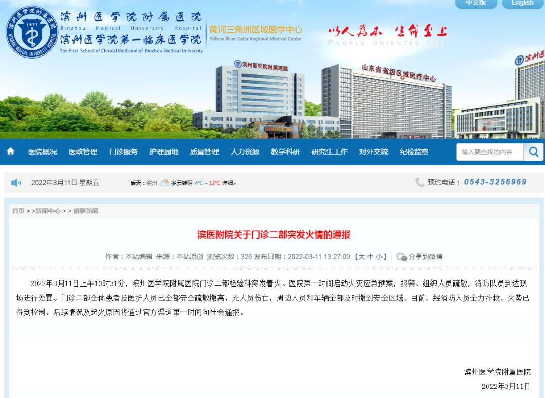2022年3月11日上午10時(shí)31分,濱州醫(yī)學(xué)院附屬醫(yī)院門(mén)診二部檢驗(yàn)科突發(fā)著火,根據(jù)醫(yī)院的通報(bào),火災(zāi)發(fā)生后,醫(yī)院第一時(shí)間啟動(dòng)火災(zāi)應(yīng)急預(yù)案,消防救援人員到達(dá)現(xiàn)場(chǎng)進(jìn)行處置,無(wú)人員傷亡,目前火災(zāi)事故發(fā)生的具體原因仍在調(diào)查中。