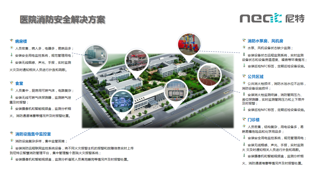 醫(yī)院屬于消防重點(diǎn)防護(hù)單位,人員相對(duì)集中,病人多且行動(dòng)不便,醫(yī)院里的儀器、化學(xué)試劑、被褥等易燃易爆品,都易成為醫(yī)院火災(zāi)的“導(dǎo)火索”,因此,保護(hù)醫(yī)院消防安全,尤為重要,尼特智慧消防解決方案從根源協(xié)助醫(yī)院預(yù)防火災(zāi)發(fā)生,保障醫(yī)院消防安全。